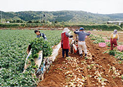 家族総出でバレイショ掘り取り