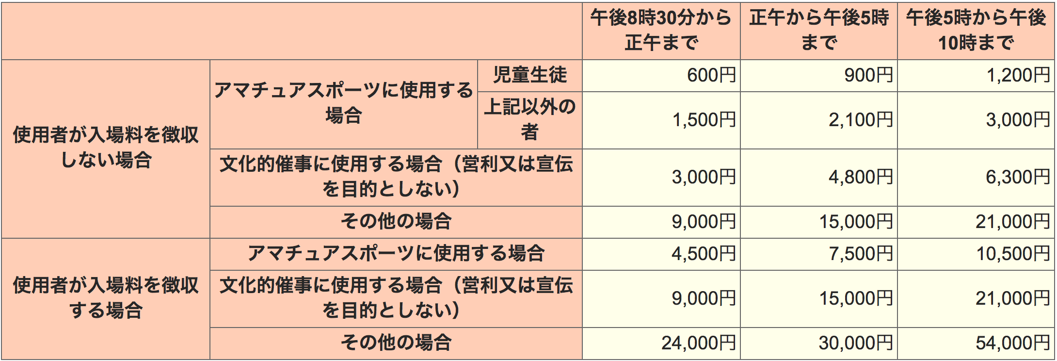 ※午前8時30分から午後5時まで、正午から午後10時まで及び午前9時から午後10時までの時間区分の使用料は、それぞれの時間区分に属する使用料欄の金額を合算した額とします。