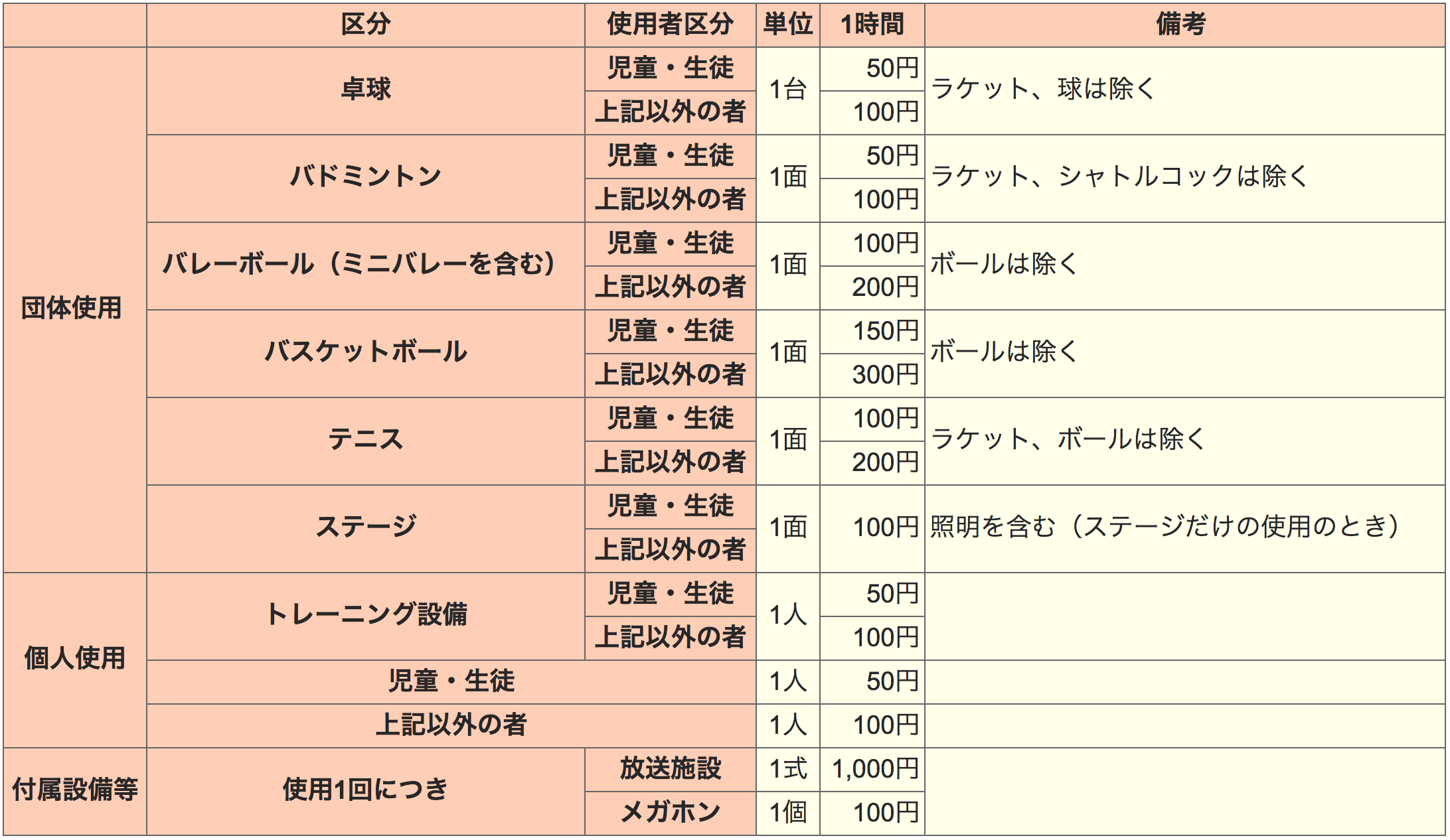 - この表に定める時間区分を超過し、又は繰り上げて使用する場合は、その超過し、又は繰り上げる1時間につきこの表に定める使用料に加算します。