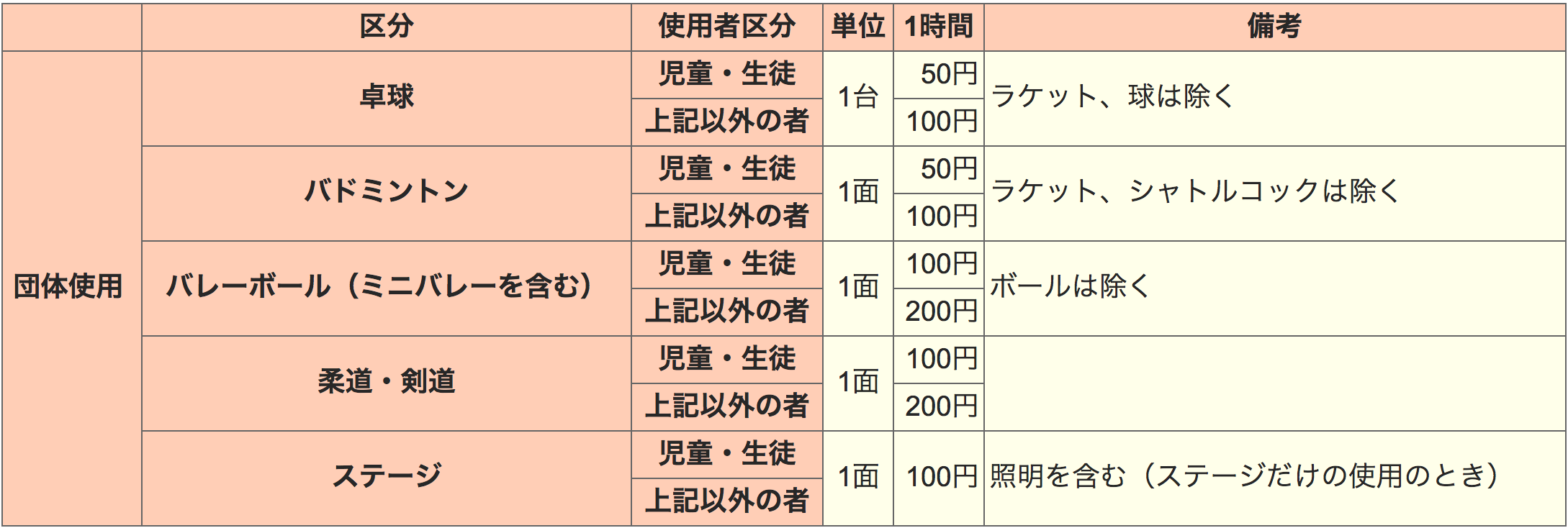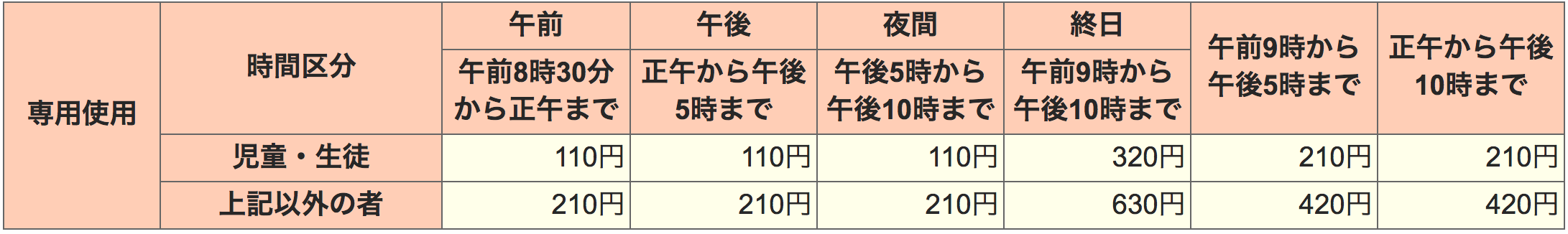 ※午前8時30分から午後5時まで、正午から午後10時まで及び午前9時から午後10時までの時間区分の使用料は、それぞれの時間区分に属する使用料欄の金額を合算した額とします。