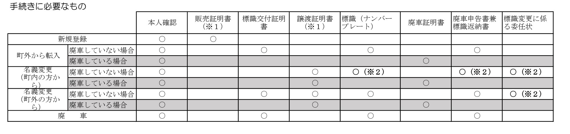 - 登録・名義変更・車両変更・住所変更・廃車などは役場ではできません。